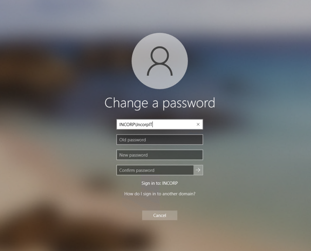 Now you will see a screen as shown below. Make sure that the top field shows ‘INCORP\‘ before your username, and then fill out the ‘Old Password‘, ‘New Password‘, and ‘Confirm New Password‘ fields. Then click on the blue arrow pointing right.